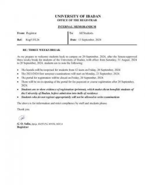 As we prepare to welcome students back to campus on 20 September, 2024, after the Senate-approved three weeks break for students of the University of Ibadan, with effect from...